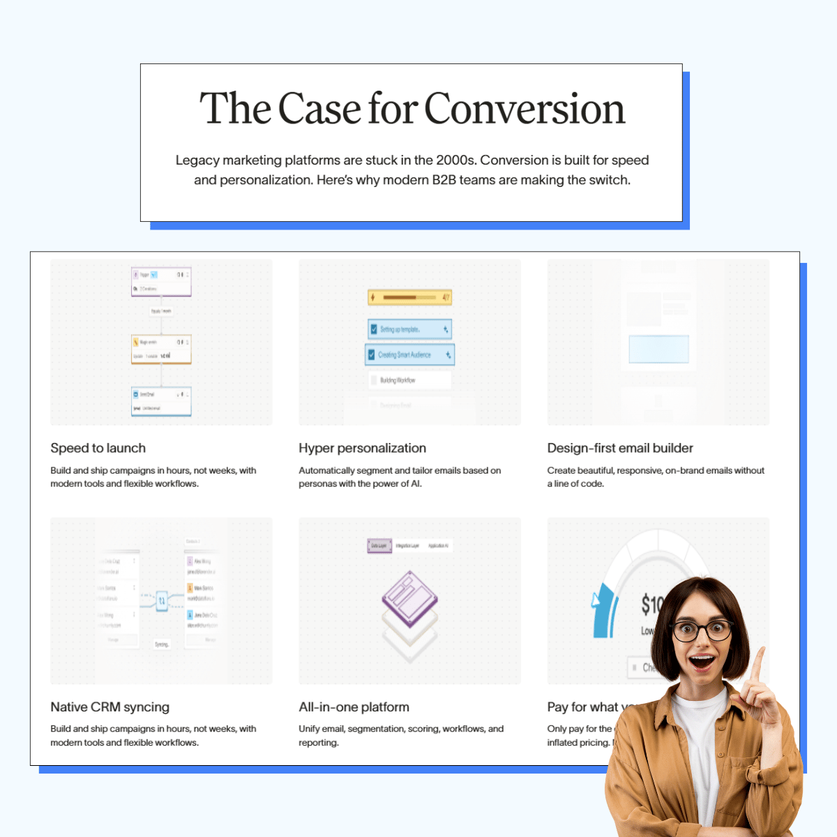 Conversion leaves nothing to chance with their “Case for Conversion” homepage section.