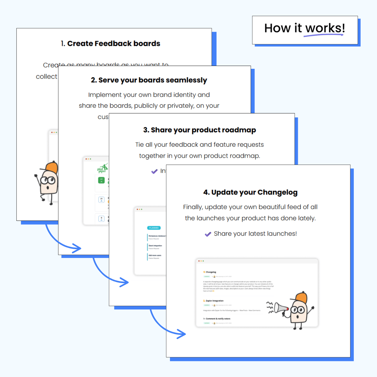 Upvoty nails this “How It Works” page by making it instantly clear what you get from their product and what it does.