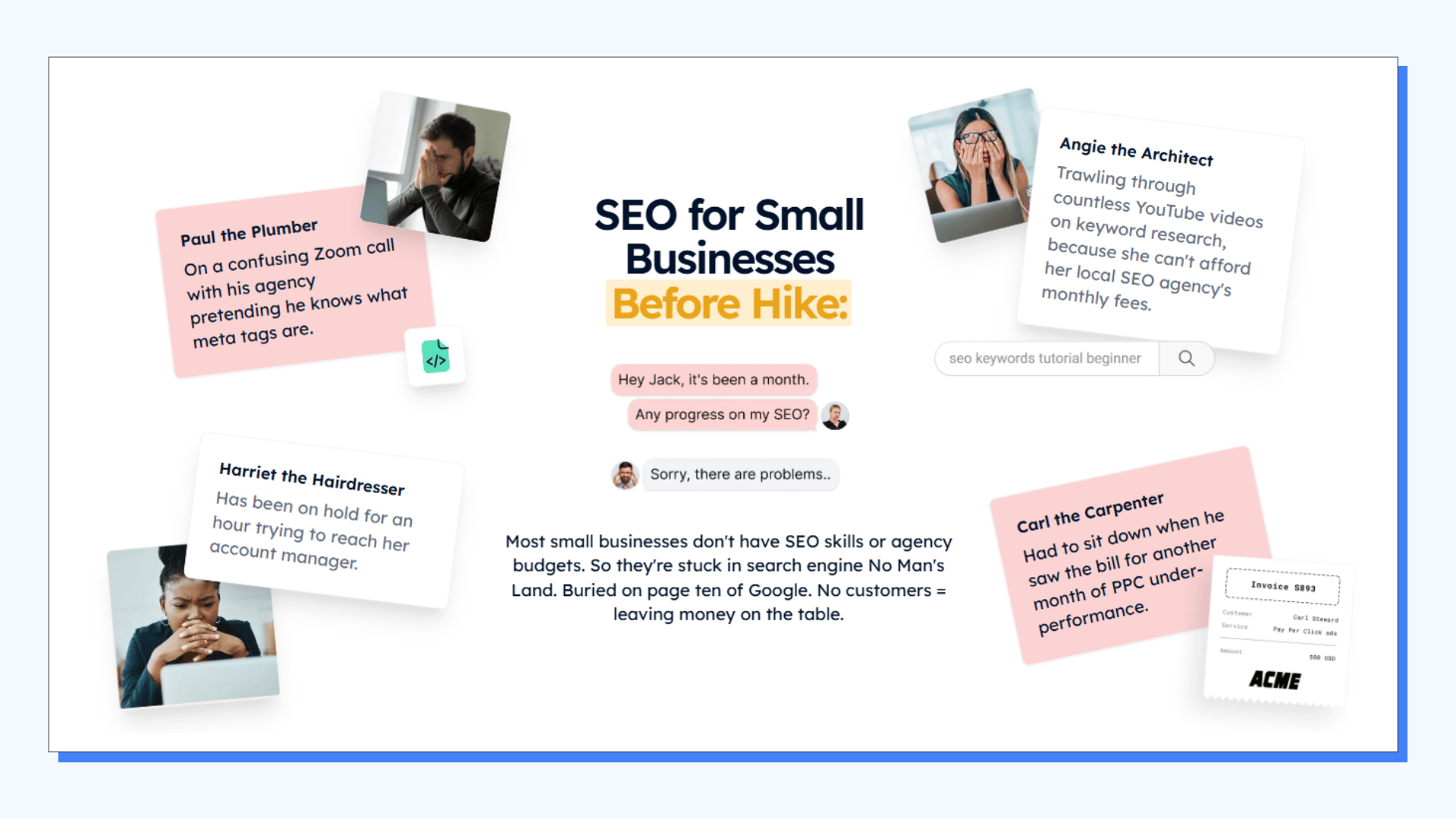 They spotlight four personas: Paul the Plumber, Angie the Architect, Harriet the Hairdresser, and Carl the Carpenter — each with a painfully relatable frustration around SEO agencies.
