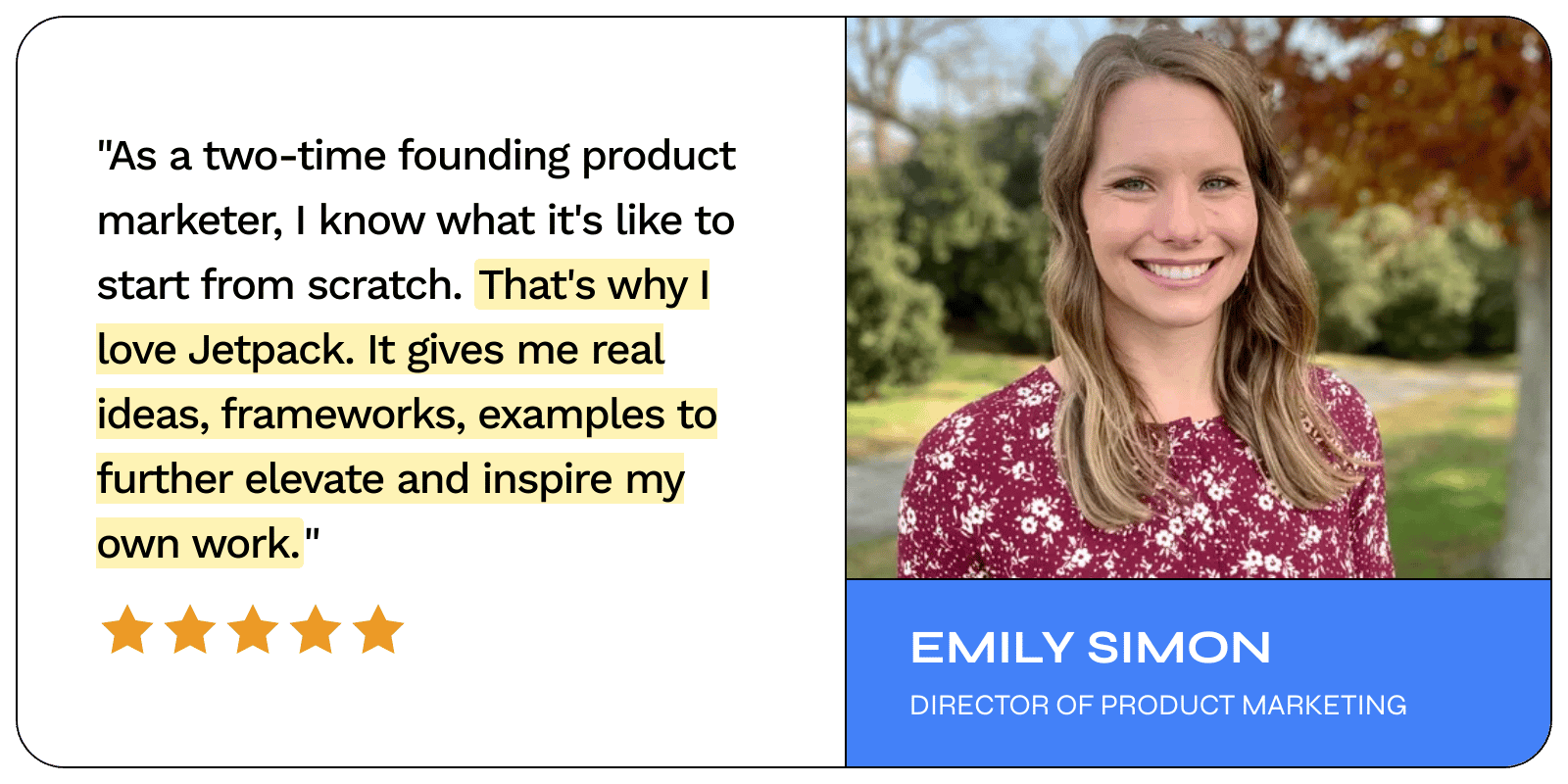 Product marketers like Emily use the PMM Jetpack to skip the unnecessary parts of building a PMM function from the ground up.