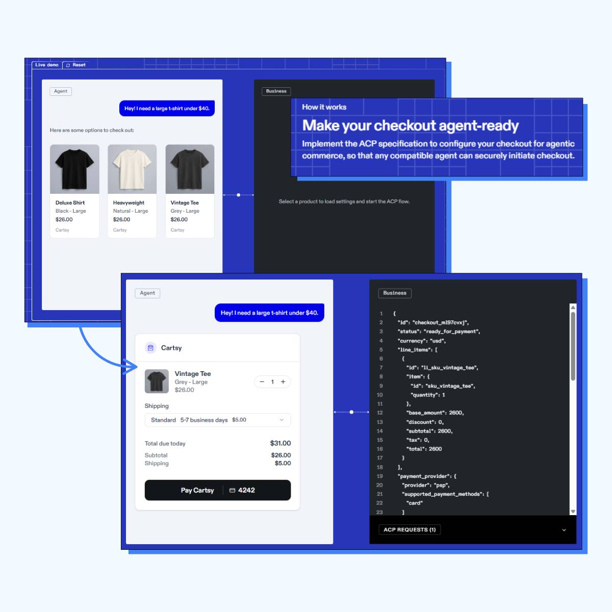 For their launch of Agentic Commerce, instead of a static walkthrough or code-heavy visuals, their interactive demo shows both worlds side-by-side.