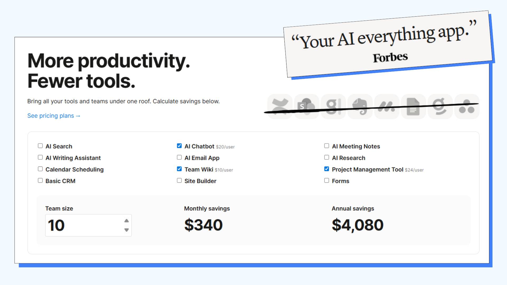This interactive calculator lets you toggle through all the tools Notion helps you replace and see how much youβd save by making the switch.