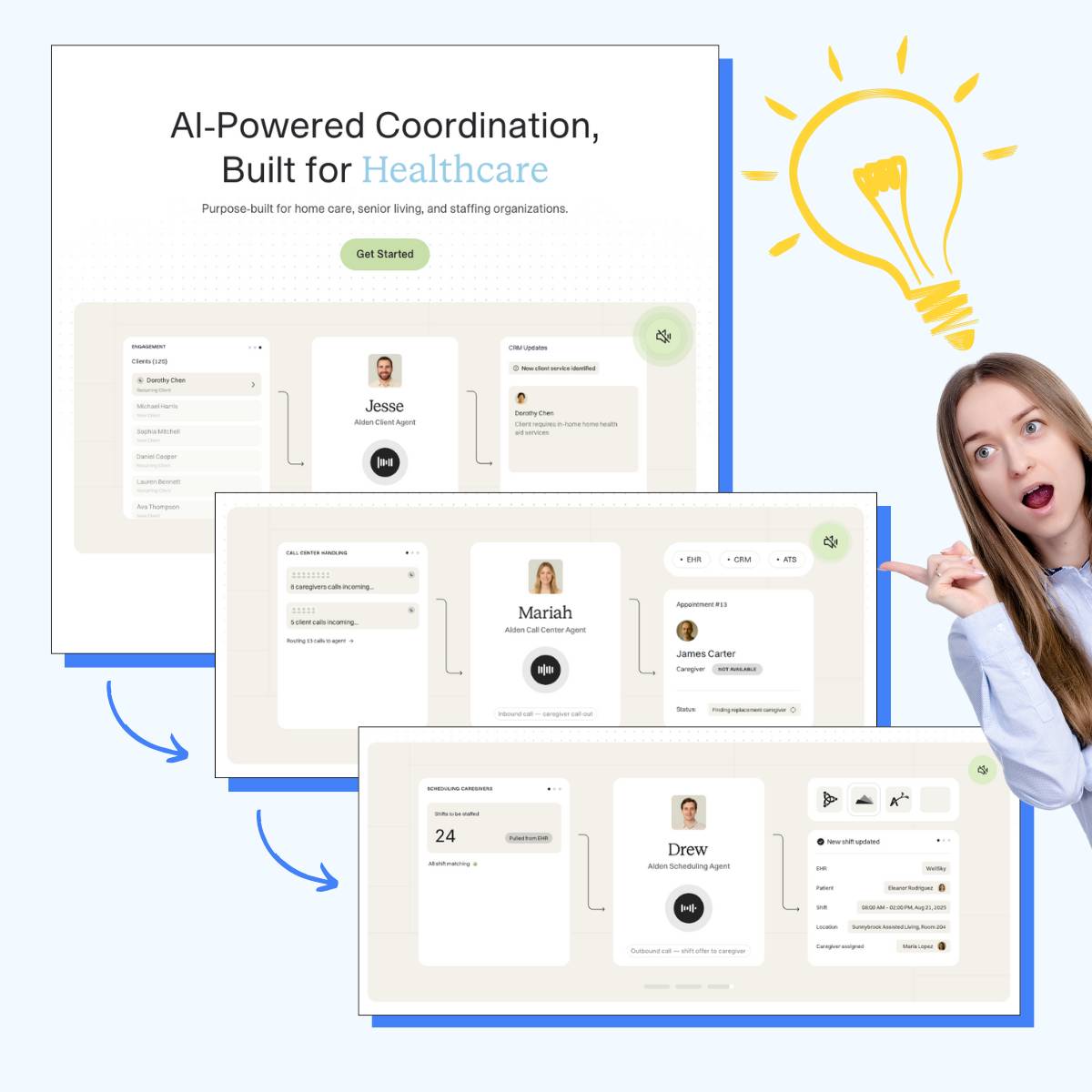Alden's homepage hero has a killer penny drop image. It walks you through three specific scenarios where their AI Healthcare Coordinators shine.