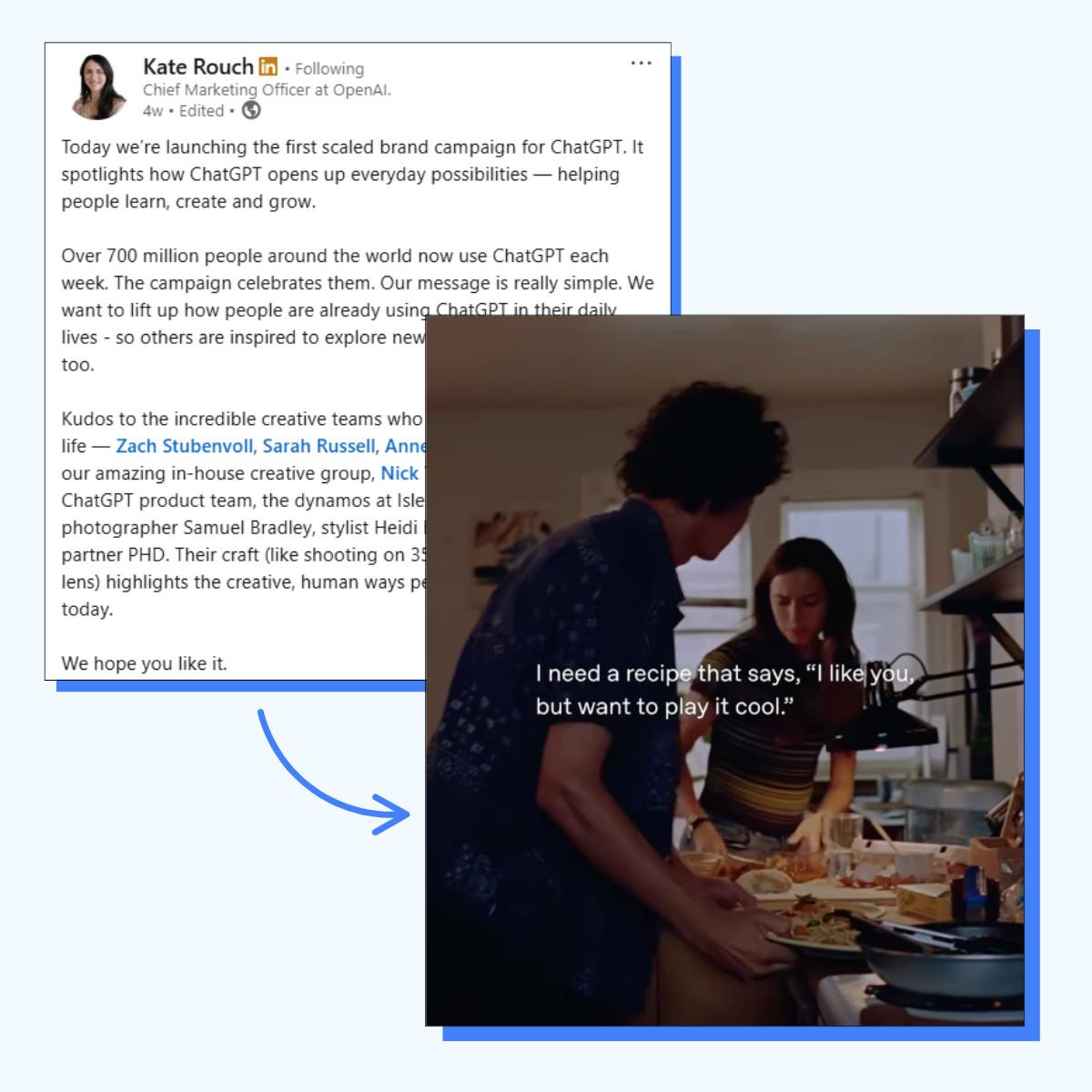 It highlights a simple, non-work moment — someone using ChatGPT to plan a date night. It brings their core message to life: “We want to lift up how people are already using ChatGPT in their daily lives.”