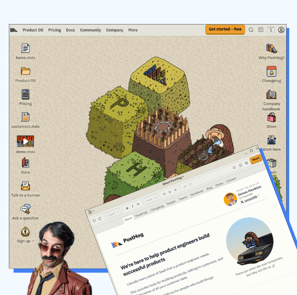PostHogβs site gives off serious 90s desktop vibes. Folders. Dropdowns. Even the demo pops up like an old QuickTime movie.