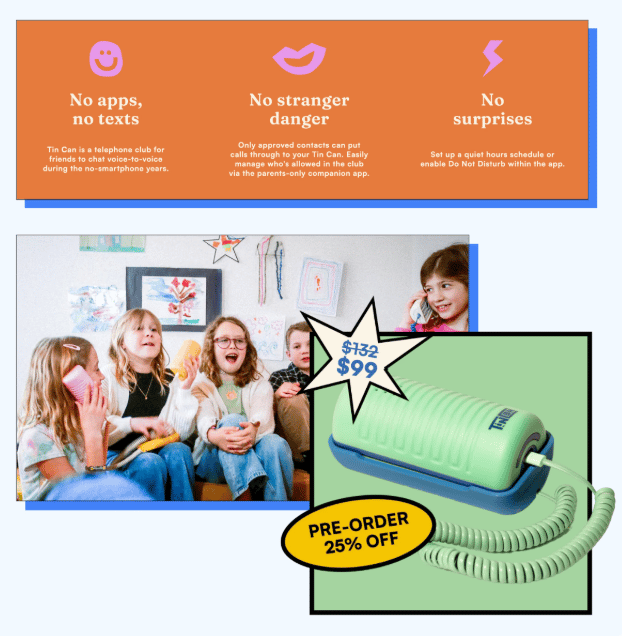 They doubled down on simple — a landline phone for kids, zero distractions, just real conversation. Tin Can owns their niche, speaking directly to parents who want safety and wholesome fun over frills.