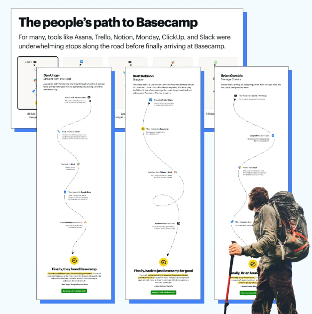 This landing page is a creative form of social proof that shows the real journeys customers went through before finding Basecamp — complete with proof points and testimonials that explain why the other platforms were “underwhelming stops” along the way.