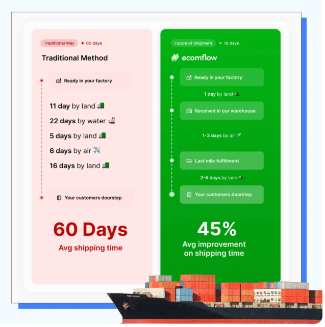 Right away, I can follow along the journey of a product being ready in my factory, to arriving on a customer’s doorstep. The old way takes 60 Days — Ecomflow takes 45% less.