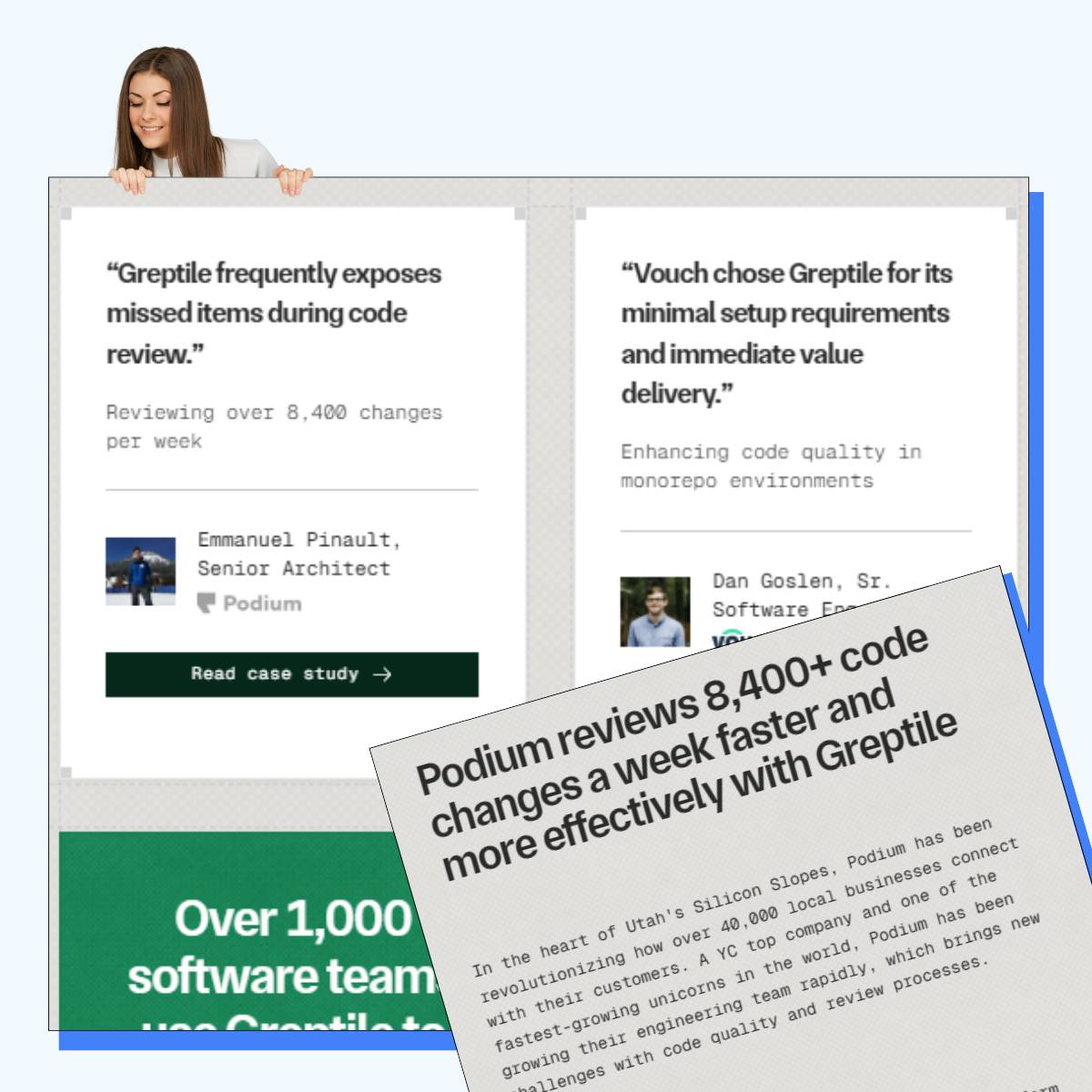 Greptileβs customer evidence page shows how to let customers do the selling.