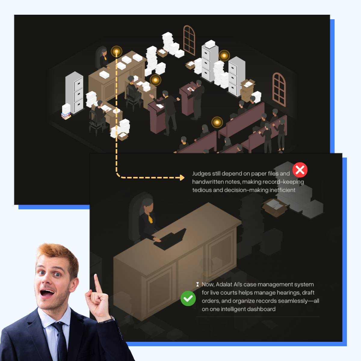They turn the courtroom into an interactive scene.