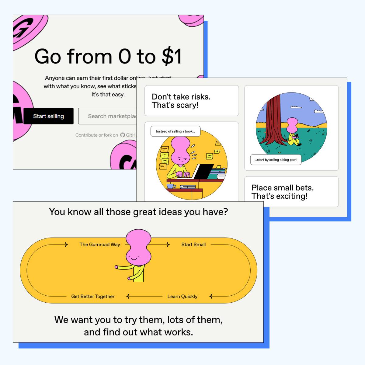 That positioning shows up everywhere on their homepage. "Start Small, Learn Quickly, Get Better Together, The Gumroad Way ."