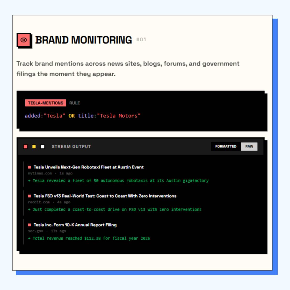 Their use cases page does a great job highlighting 10 things you can do with Firehose. On the left, you see how to set up the rule in Firehose; on the right, the output you get.