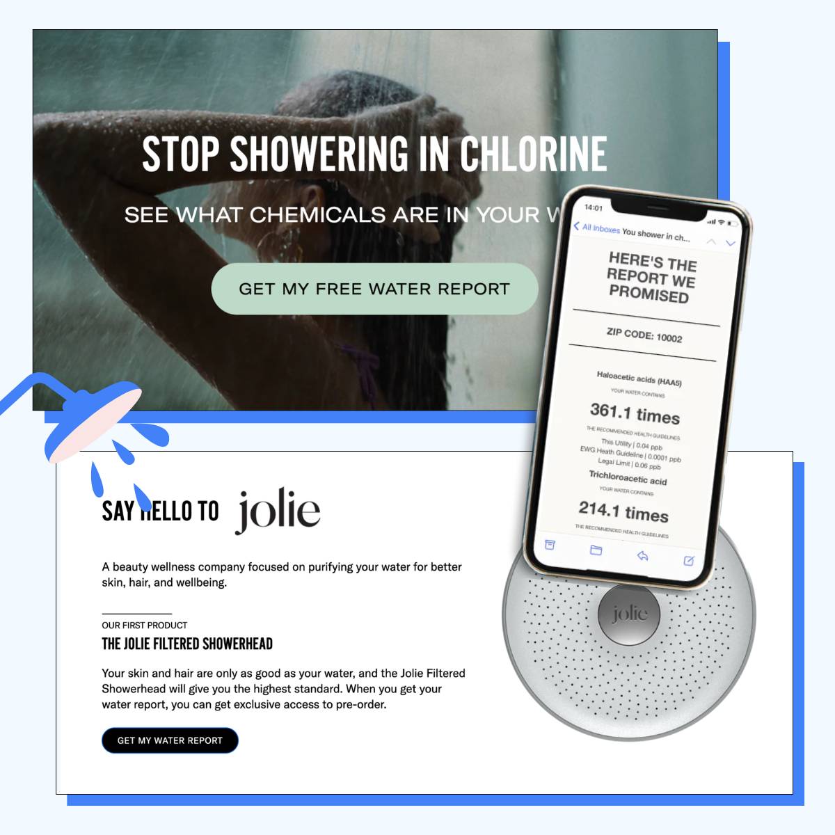Jolie sells a filtered showerhead that purifies your shower water. If they want people to pay $150 for the hardware + $120/yr for replacement filters, they need to convince them thereβs a problem worth solving.